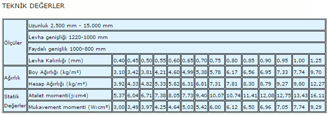 ● Levha kalınlığı min. 0.40 mm, maks. 1.25 mm