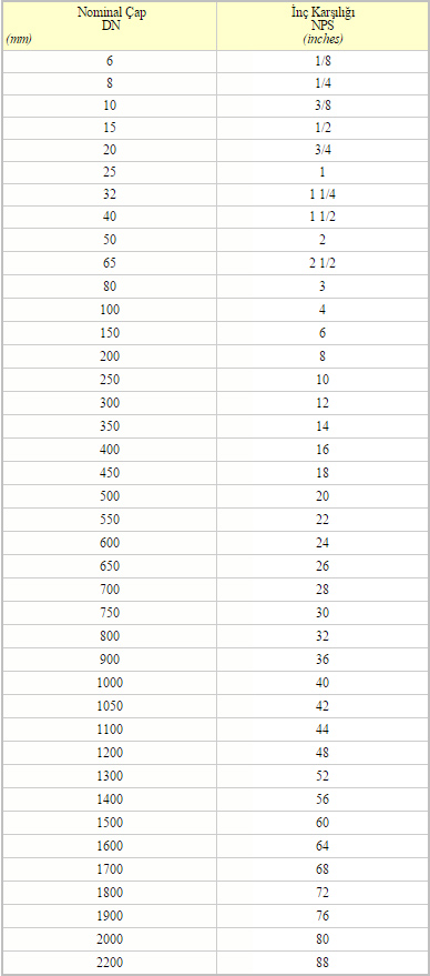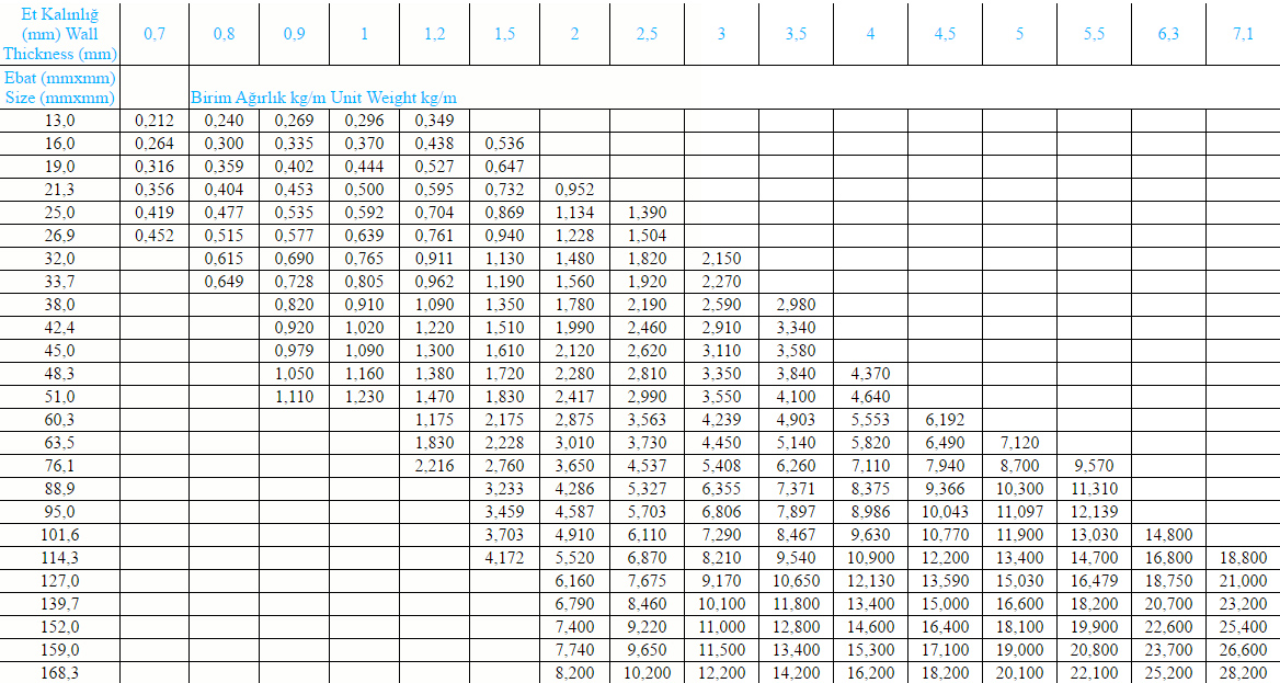 Dış çap: Q 13 mm. - 168,3 mm. , Et kalınlığı: 0,7 mm. - 7,1 mm.